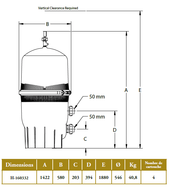 Filtre à cartouche Pentair Water H-160332 - Débit 34 m3/h - Surface filtrante 48.3m² - Diamètre 546mm