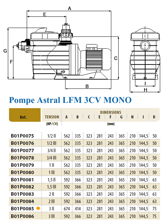Pompe de filtration Astral LFM 3 cv mono - 34m3/h